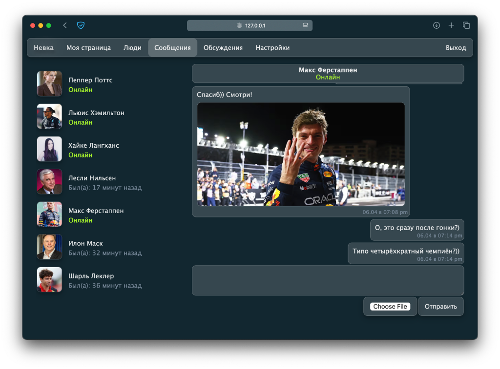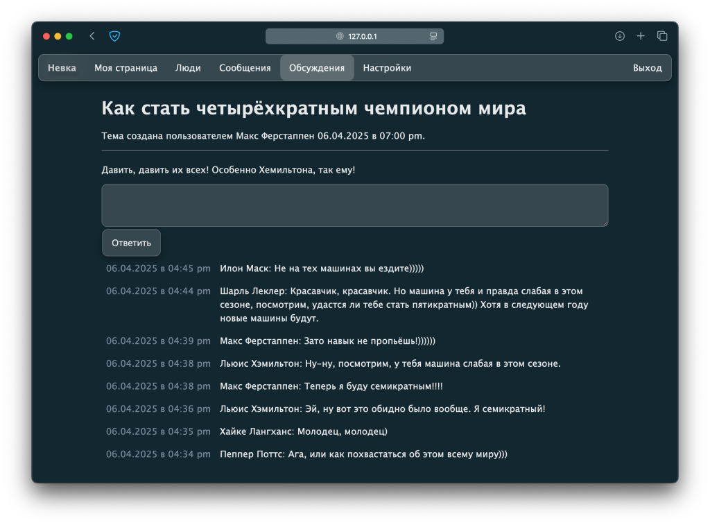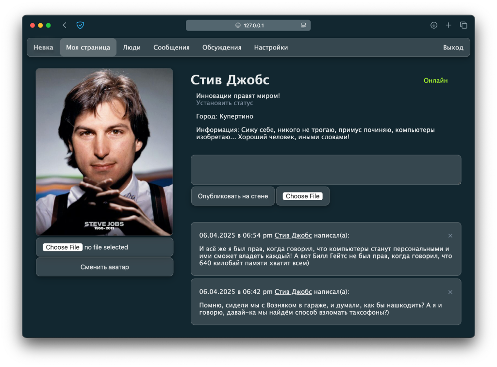 На выходе получилась простая, но лаконичная социальная сеть с личными страничками, сообщениями и обсуждениями, а так же с мобильной версией сайта.